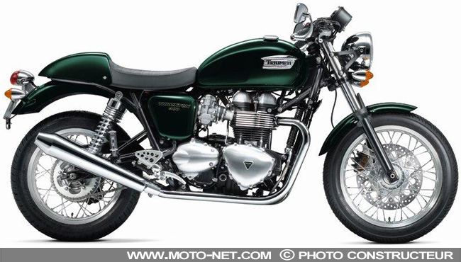"Thruxton : le Café Racer. Réinventé. Baptisée d'après le circuit de course sur lequel Triumph régnait, et inspirée des fameux "Ton Up Boys" des années 60. La Thruxton est la plus sportive des motos classiques Triumph, un Café Racer authentique qui offre cette expérience incomparable du bicylindre britannique. Guidon bas, position de conduite sportive, roues à rayons avec jantes aluminium (18" à l'avant et 17" à l'arrière), silencieux type mégaphone et moteur bicylindre parallèle moderne de 865 cc. Elle attire ceux qui étaient là à l'époque et ceux qui recherchent la décontraction du look sportif rétro classique. ".
