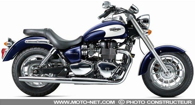 "Un style de cruiser classique associé à une puissance sans effort : la nouvelle America offre une expérience de cruiser authentique avec un côté typiquement "british". La Triumph America garantit une expérience de conduite incomparable, 100% Triumph. Prenez place, bien calé dans la nouvelle selle basse, saisissez le guidon reculé et appuyez sur le bouton du démarreur pour entendre le rugissement du traditionnel bicylindre parallèle britannique de 865 cc refroidi par air, avec calage à 270 degrés et doubles silencieux en cônes inversés".