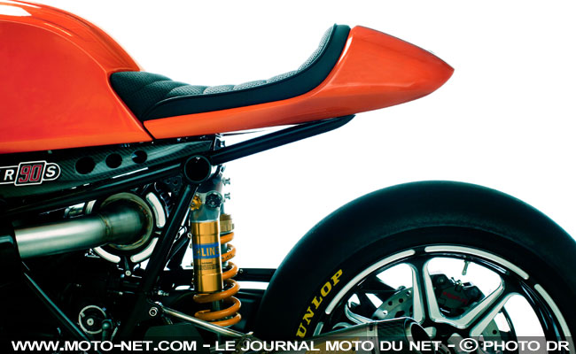 Au pied de cette fourche à cartouches (comme en MotoGP !), des étriers quatre pistons à fixation radiale confirment le côté sportif de ce séduisant concept. Même chose pour l'amortisseur Öhlins, les jantes à bâtons polis entourées de gros pneus Dunlop slicks ou encore les bracelets placés très bas et les repose-pied racing.