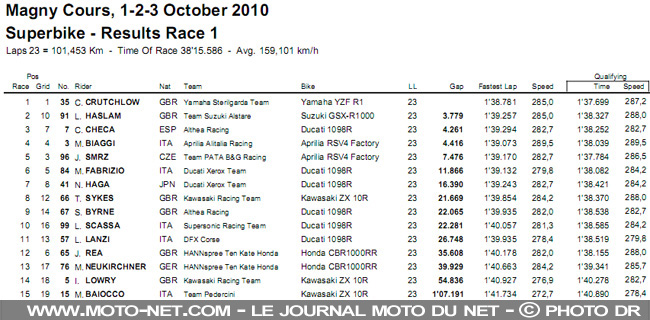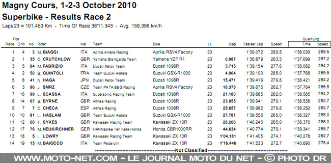 La finale du Mondial Superbike 2010 s'est déroulée cet après-midi sur la piste de Magny-Cours. Après Crutchlow, c'est le champion Biaggi qui s'est imposé en seconde manche. En SSP, Sofuoglu remporte son deuxième titre mondial. Compe-rendu...