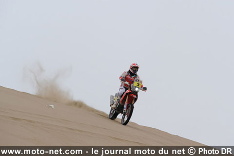 A commencer tout d'abord par Honda avec sa CRF 450 Rally : en l'espace de deux ans seulement, la moto du premier constructeur mondial s'est méchamment affûtée, jusqu'à égaler la référence KTM, voire la surpasser dans certains domaines. Hier, dans les dunes du Chili, la CRF a justement fait valoir ses atouts, à savoir une puissance pure aussi élevée qu'exploitable et un excellent équilibre.