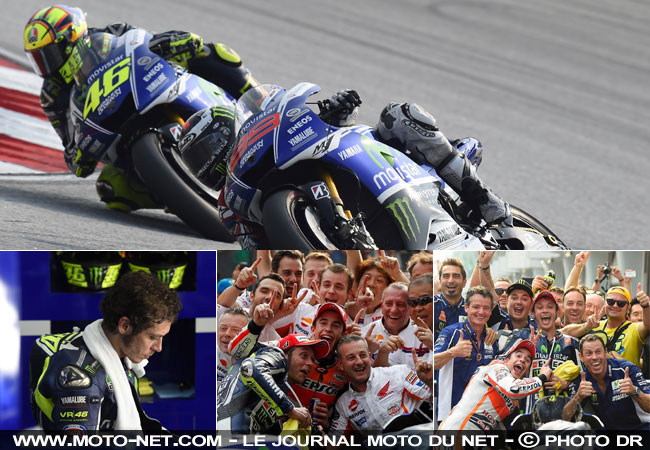 Heureux d'avoir de nouveau battu ce même Lorenzo et de s'être montré capable de mener temporairement la course, le n°46 avait un sourire aussi large que celui du gagnant. L'étendue de la joie des deux rivaux se mesure d'ailleurs sur les vignettes ci-dessus, où ils "s'incrustent" tour à tour au milieu de l'équipe adverse au moment de la traditionnelle photo officielle prise dans le parc fermé à l'arrivée !