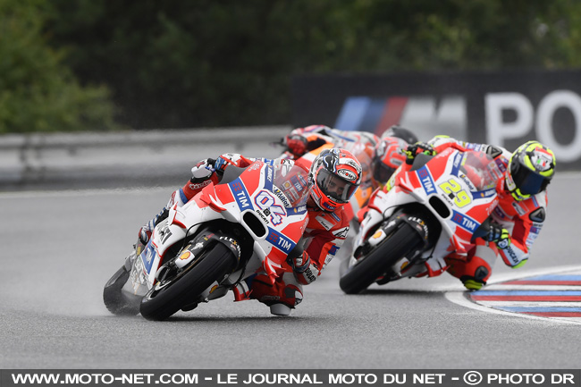 Andrea Dovizioso, Ducati Team (7ème aux qualifs, abandon en course) : "Je suis vraiment déçu car j'étais très compétitif et j'étais en mesure de faire un bon résultat. Pour la course, on a opté pour les mêmes pneus que ceux qu'on avait choisis au warm-up. Ils s'étaient montrés excellents dans des conditions vraiment humides, mais la pluie s'est arrêtée avant la course et même si la piste restait humide le pneu avant s'est très vite détérioré de façon anormale. A tel point que j'ai dû rentrer aux stands. C'est vraiment dommage car c'était une excellente occasion de faire un bon résultat. Je suis un peu découragé de quitter Brno sans points..."