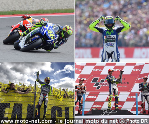 D'abord, en assénant un rythme incroyablement soutenu et régulier du premier au dernier tour : à moto égale, son coéquipier Jorge Lorenzo termine tout de même 14,576 secondes derrière ! Vraisemblablement très à l'aise avec le nouveau châssis étrenné lors des essais post-GP de Barcelone, le n°46 décroche à Assen sa neuvième victoire en Grands Prix (une en 125, une en 250 et sept en MotoGP).
