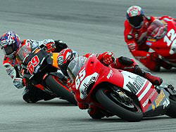 Au 10ème passage, Rossi est en tête avec une seconde d’avance sur Gibernau, 3 secondes sur Biaggi, 6,5 secondes sur Checa qui voit revenir Capirossi et Hayden, presque 10 secondes sur Bayliss, et 13 sur Ukawa qui a passé Nakano ! Dans les tours suivants, Biaggi revient sur Gibernau tandis que la bagarre bat son plein entre Checa, Capirossi et Hayden. Ce dernier parvient enfin à passer Capirossi dans un superbe enchaînement du 13ème tour. Gibernau a remis du charbon sous la menace de Biaggi et revient légèrement sur Rossi, tournant plus vite que lui aux 12ème et 13ème tours. A six tours de l’arrivée, Capirossi décroche et seul Hayden est en mesure d’inquiéter Checa. Il tente un freinage mais sort large et voit repasser "El Toro" . En tête, Rossi a accéléré, lui aussi, et tourne dans des temps légèrement meilleurs que Gibernau. Biaggi tourne jusqu’à une seconde moins vite que les deux leaders !