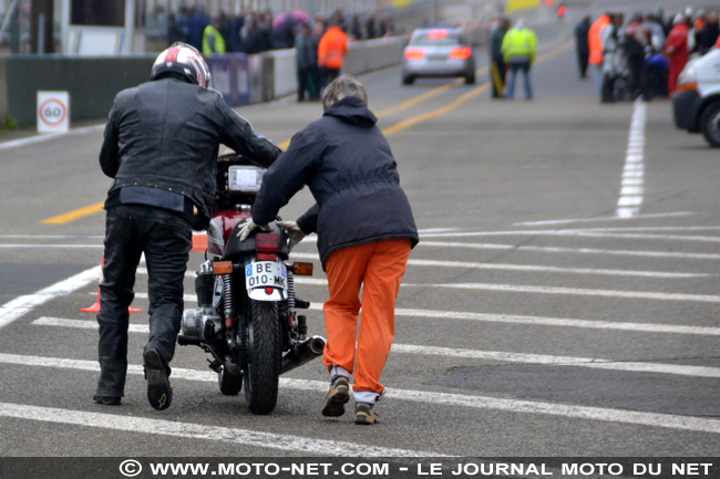 Pas de chance en revanche pour Guy Marchand, le pilote de la Honda 750 Four. Toujours présent sur le podium "Anciennes", il n'y sera pas à cette édition de la Sarthe... Il s'en est collé une dans le premier tour chrono et doit abandonner (carter d'allumage arraché, entre autres...).
