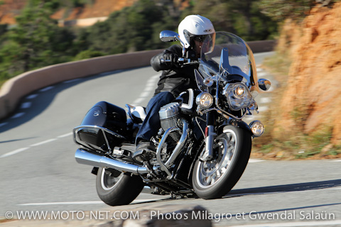 Malgré son gabarit imposant et ses quelques 337 kg en ordre de marche, la California 1400 Touring se livre facilement. Ramenée à 740 mm, la hauteur de selle basse facilite l'accès aux conducteurs de petite taille.
