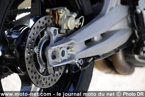Le comportement de la moto en courbe est en revanche un peu moins bon. Le lâcher puis la reprise éventuelle du frein avant entraîne une variation trop importante de la trajectoire pour continuer à attaquer de la sorte. L'intervention sur le frein arrière est plus discrète, mais le mieux est de ne pas avoir à intervenir du tout !