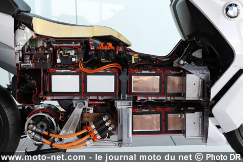 BMW Motorrad profite largement de l'expérience de la branche - tronc ! - BMW automobile en matière de mobilité électrique : outre l'utilisation des modules d'accumulateur de la i3 (trios modules sur le scooter, huit sur la voiture), le C evoluton embarque certains composants électroniques communs aux i3 et i8.