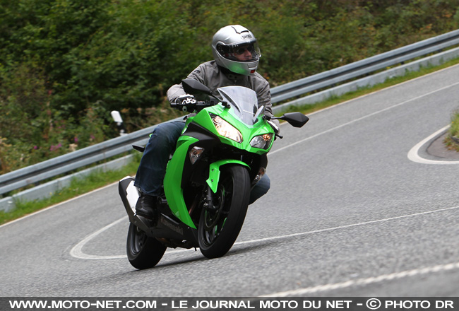 Néanmoins, sous ses atours de sportive, il ne faut pas oublier que la Ninja est une petite routière d’entrée de gamme. Aussi vive et rigoureuse soit-elle, ses limites finissent pas s'atteindre assez facilement : à grande vitesse sur des revêtements bosselés, la fourche de 37 mm perd en précision et la moto tend à se désunir. Rien de dangereux, mais cela suffit pour inciter à soulager les gaz.