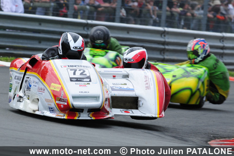 En première manche side-cars, malgré un départ raté, l'équipage Delannoy / Lavorel s'impose après avoir pris la tête de la course à leurs rivaux Barbier / Debroise dès le huitième tour. En trophée F2, le duel Guignard / Poux - Leblond / Quintre tourne à l’avantage de Guignard et Poux.