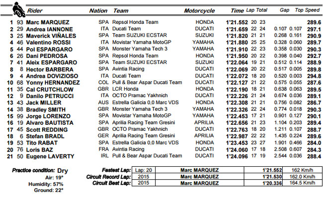 Lui aussi pénalisé par ce souci hier, Valentino Rossi est cependant parvenu à trouver des solutions pour revenir à la 4ème place juste avant les qualifications sur un bitume désormais à température correcte (22°C ce matin). L'italien précède Pol Espargaro et Dani Pedrosa, en bien meilleure forme ce samedi sous le soleil.