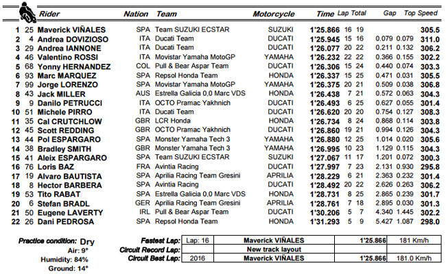 Le jeune pilote Suzuki, futur coéquipier de Rossi l'an prochain sur Yamaha, a pris le meilleur sur une piste très froide (14°C), ce qui suggère que son chrono de 1'25.866 va sensiblement baisser au fur et à mesure que la température atteindra une fourchette plus propice aux performances (seulement 9°C dans l'air ce matin).
