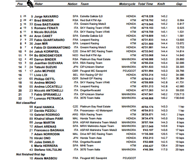 Arrivée : Profitant des bagarres derrières, Navarro se forge un avantage décisif de six dixièmes juste avant le dernier tour, ce qui lui permet de se diriger vers sa première victoire en Grands Prix sans être inquiété. Une consécration justifiée pour l'espagnol de 20 ans, ancien coéquipier de Fabio Quartararo qui termine 7ème.