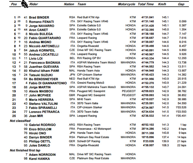 Arrivée : Brad Binder repasse en tête en dépassant Fenati dans le Raccordement à l'amorce du dernier tour. L'officiel KTM réalise une ultime boucle parfaite, bloquant toutes les attaques possibles grâce à un gros rythme et des trajectoires protectrices. Le leader du championnat remporte sa deuxième victoire de la saison, portant son avantage au provisoire sur Navarro à 24 points.