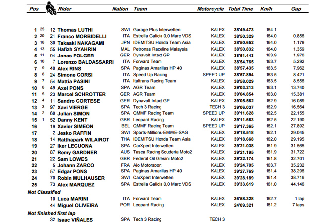 Arrivée : Thomas Lüthi, seul en tête suite à l'accrochage "Zarco-Lowes", file sans être inquiété vers sa seconde victoire de la saison, prenant une belle revanche sur sa dernière course terminée dans la douleur d'une chute. Franco Morbidelli et Takaashi Nakagami complètent le podium.