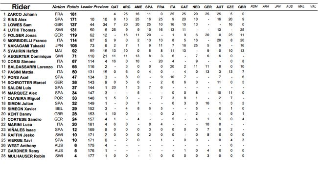 Au final, le pilote qui réalise la meilleure opération est Alex Rins, huitième à l'arrivée alors qu'il s'élançait de la 19ème position avec une épaule en vrac ! Par conséquent, l'écart du futur pilote Suzuki sur Zarco passe de 19 à 10 points, alors que Rins s'élançait avec l'unique objectif de ne pas trop en perdre !