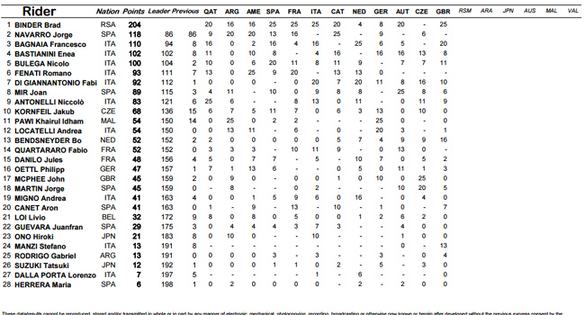 Le leader du championnat, auteur de huit podiums dont quatre victoires en onze courses, porte son avance à 86 points sur Navarro, qui perd de nouveau de gros points en raison de sa chute à Silverstone. Francesco Bagnaia profite de sa seconde place pour remonter de la 5ème à la 3ème position au provisoire, avec 8 points de retard sur Navarro.