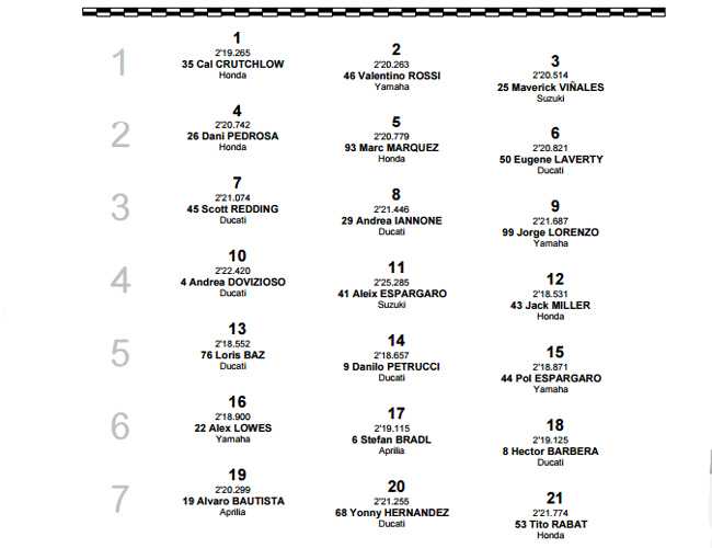 Malgré ses efforts en fin de séance, Valentino Rossi se qualifie à la deuxième place avec 0,998 sec de retard sur la pole, suivi par Maverick Viñales qui s'est transcendé pour décrocher la troisième place dans des conditions qu'il n'apprécie pas habituellement.