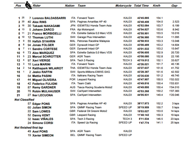 Arrivée : Lorenzo Baldassari, très pressant, passe à l'offensive à deux tours de l'arrivée, dépassant Alex Rins par l'intérieur. L'espagnol tente de répliquer dans la dernière boucle, mais il se rate au freinage et doit élargir dans les dégagements bitumés : il s'en même est fallu de peu pour que Rins ne perde la deuxième place ! "J'avais très mal à l'épaule sur la fin", confesse Rins, battu par Baldassari à l'arrivée. Il s'agit de la première victoire d'un pilote italien à domicile en Moto2 depuis celle d'Andrea Iannone en 2012.