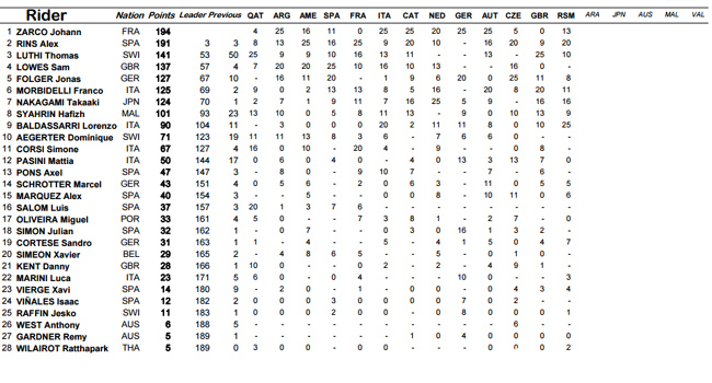 Alex Rins réalise malgré tout une excellente opération avec cette deuxième place puisqu'elle lui permet de réduire l'écart sur Johann Zarco (4ème à 9 secondes) de 10 à 3 points au provisoire. Autant dire que le championnat est très ouvert entre les deux futurs pilotes du MotoGP, car il reste encore cinq courses à disputer, soit 125 points à distribuer... A suivre naturellement de prè sur MNC : restez connectés !