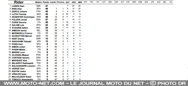 Au championnat provisoire, Sam Lowes chipe les commandes à Tom Lüthi qui passe de la première à la quatrième position. Grâce à sa victoire, Alex Rins passe deuxième devant le tenant du titre Johann Zarco, annoncé sur une MotoGP Suzuki l'an prochain.