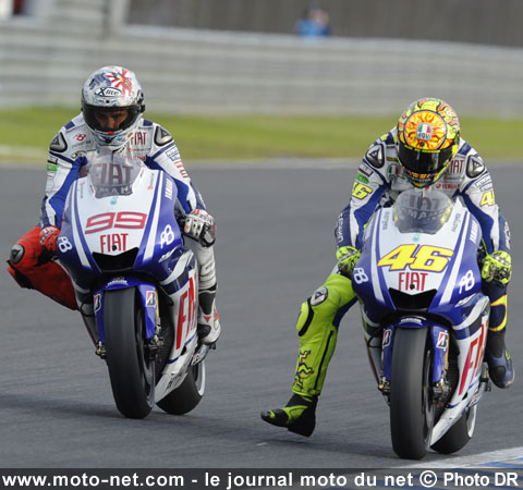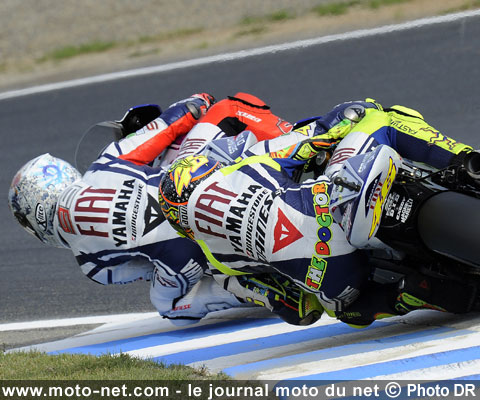 Plusieurs fois à la limite, les deux pilotes Fiat-Yamaha ont offert un spectacle à couper le souffle qui a grandement participé à décupler l'intérêt d'un Grand Prix à l'issue qui semblait pliée dès le premier tour. En outre, si la combativité de Rossi entraîne des sentiments mitigés (lire vos commentaires !), les répliques immédiates de Lorenzo qui n'a rien voulu céder malgré son statut au championnat démontrent qu'il ne se contente pas d'assurer en attendant d'enfiler une couronne qui lui tend les bras dès le prochain Grand Prix en Malaisie !