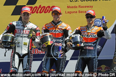 Tour à tour battu par Spies (à Assen), Lorenzo (au Mugello) et Pedrosa (au Sachsenring), le leader du championnat a réagi avec la manière à Laguna Seca : après avoir trouvé le remède aux maux de sa Honda RC212V (qui souffrait de problèmes d'adhérence en milieu et en sortie de courbe) lors du warm-up, le n°27 a réalisé une course intelligente, à la fois tactique et offensive.