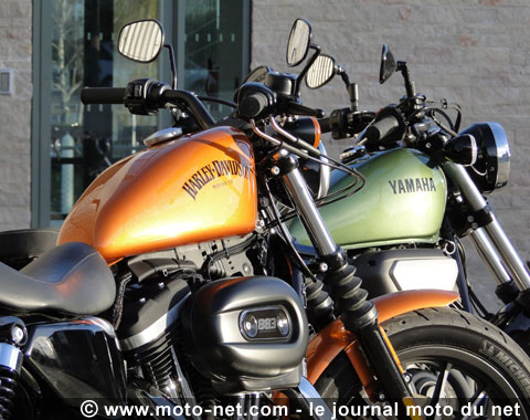 Même silhouette ramassée et minimaliste, des dimensions générales presque identiques (2255 mm de long et 745 mm de large pour la H-D, 2290 et 775 pour la Yam'), une architecture moteur et une partie cycle similaires (bicylindre en V et double berceau en acier)... La XV950R, appelée "Bolt" de l'autre côté de l'Atlantique, fait certes oublier la Midnight Star XVS950 dont elle est issue (moteur et châssis), mais son aspect général renvoie incontestablement au "petit" Sportster !