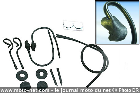 Rappelons que le Tuyaucom est un astucieux système permettant de discuter à moto avec son passager par le biais de simples tuyaux... d'où son nom ! A une extrémité se trouve une pièce en plastique à placer dans la mentonnière, qui fait office de "micro", et de l'autre une oreillette que l'on moule pour l'adapter à la forme de son oreille (vignette ci-dessous).