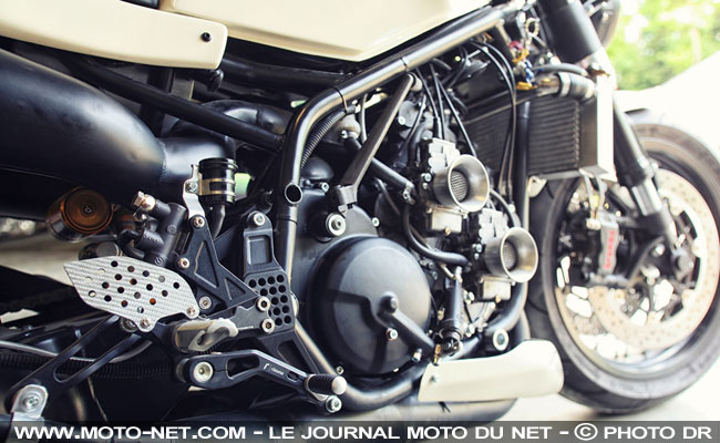 Au passage, le freinage est renforcé avec des disques de 340 mm pincés par des étriers radiaux Brembo, tandis que des suspensions haut de gamme et sportives Öhlins assurent une tenue de route sans doute nettement supérieure aux suspates d'origine !