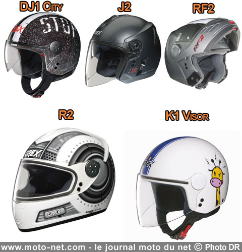 Mais revenons - en douceur... - à nos casques ! La gamme Grex 2011 se compose de cinq nouveaux modèles réalisés en Lexan, comme l'intégralité des casques Nolan et Grex : le demi-jet DJ1 City et son écran en forme de larges lunettes (à partir de 84,95 euros), le J2 (un élégant semi jet doté d'un écran solaire et de mousses amovibles, disponible à partir de 129,95 euros), le RF2 (un modulable bien équipé au tarif serré de 179,95 euros), le R2 (un intégral avec écran traité anti-rayures et mousses amovibles vendu à partir de 104,05 euros) et enfin le Grex K1 Visor (un demi-jet pour enfants à partir de 89,95 euros).