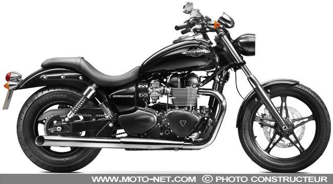 Pour sa part, la Speedmaster joue la carte noire du phare à la jante arrière, en passant par le guidon, la couronne, le sélecteur, la pédale de frein, les supports de repose-pieds, les ressort d'amortisseurs, la boîte à air, le support de batterie, etc.