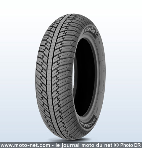 Estampillé "M+S" sur ses flancs ("Mud" pour boue + "Snow" pour neige), ce nouveau pneu scooter se distingue par son emploi d'une "thermo-gomme" qui conserverait ses capacités d'adhérence et sa souplesse jusqu'à -10°C.