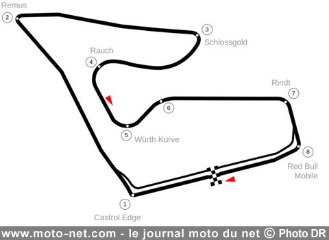 "Le deuxième virage est le plus critique, le point de freinage se trouve à 315 km/h sur l'angle à gauche. Le mur étant vraiment proche de la piste, cela pourrait se révéler dangereux sur une perte de l'avant... Les autres freinages sont moins critiques, car la moto est droite au freinage. Le dernier virage est aussi à risques, en particulier si vous êtes victimes d'un highside car vous pouvez taper le mur".