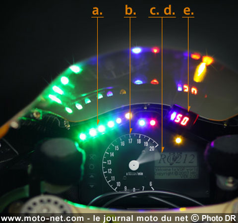 Les leds signalées par la lettre "a" indiquent tout d'abord le secteur du circuit où la moto se trouve : traditionnellement, les tracés MotoGP sont divisés en quatre secteurs sur lesquels la RCV se repère grâce à son GPS embarqué.