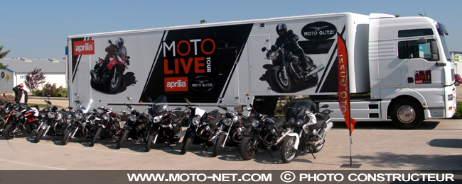 Le Moto Live Tour, structure itinérante lancée en 2010 et toujours orchestrée par Piaggio France, repart sur les routes cette année ! "Puisque chaque motard, chaque moto, chaque route est différente, Aprilia et Moto Guzzi offrent des essais sur mesure", rappelle le groupe italien.