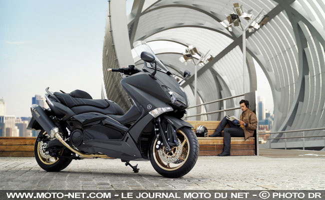 La nouvelle version Tmax 530 Black Max repousse - encore - plus loin l'agressivité visuelle du célèbre maxi-scooter sportif Yamaha. Disponible uniquement en noir bitons (d'où le nom), ce Black Max adopte une décoration spécifique qui comprend des jantes, des logos, des embouts de poignées et des coutures de selle dorés.