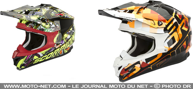 Evolution aussi pour le casque de cross VX-15 Air, dont les lignes gagnent en agressivité au niveau de la mentonnière et de la visière, notamment. Les nombreuses décorations, l'un des points forts chez Scorpion, évoluent elles-aussi sur ce VX-15 Evo Air.