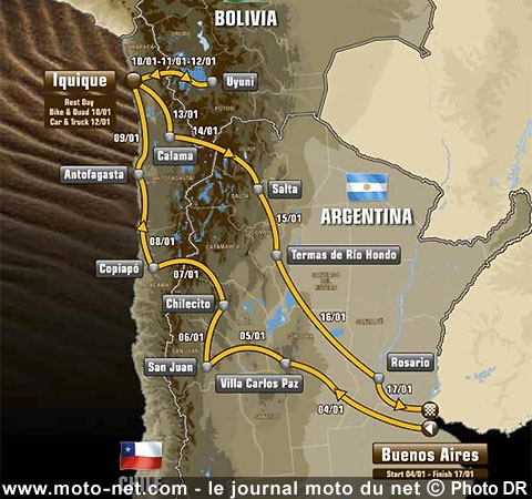 Composé de plus de 9000 km de routes et de pistes à travers l'Argentine, le Chili et la Bolivie, ce nouveau parcours fera en outre la part (encore plus) belle à la gestion de l'effort et de la mécanique, puisqu'encore plus "d'étapes marathon" sont au programme.