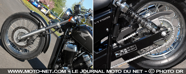 Économies obligent, la VT750S est équipée d'un frein à tambour à l'arrière et d'une transmission finale par chaîne. Néanmoins, on note que certains éléments "vitaux" sont présents : de mignons commodos et rétroviseurs chromés et un bocal de liquide de frein assorti. Les rétros et le feu arrière brillent également, mais leurs tailles sont un poil excessives pour les rendre jolies - oui c'est subjectif, et alors ?