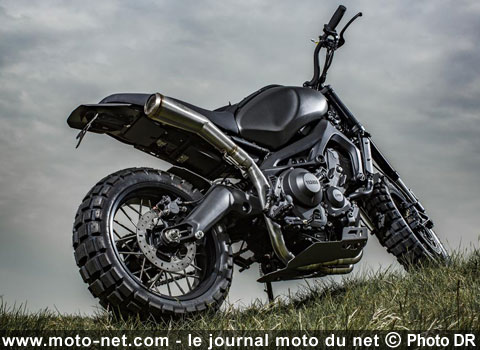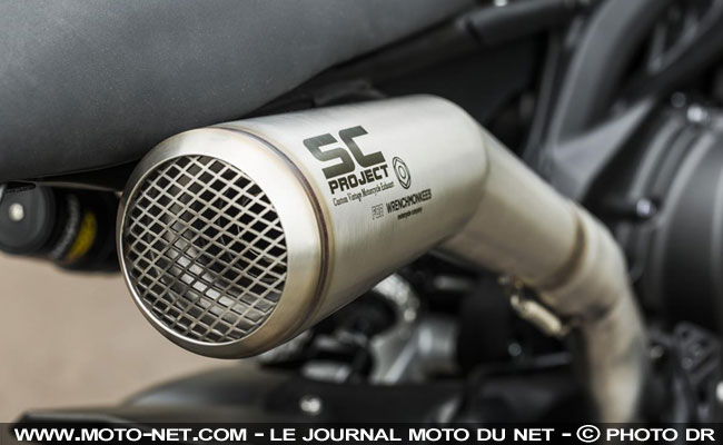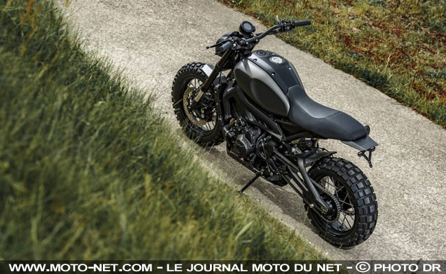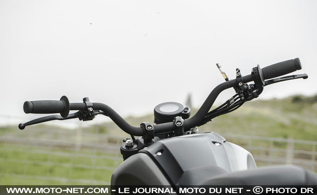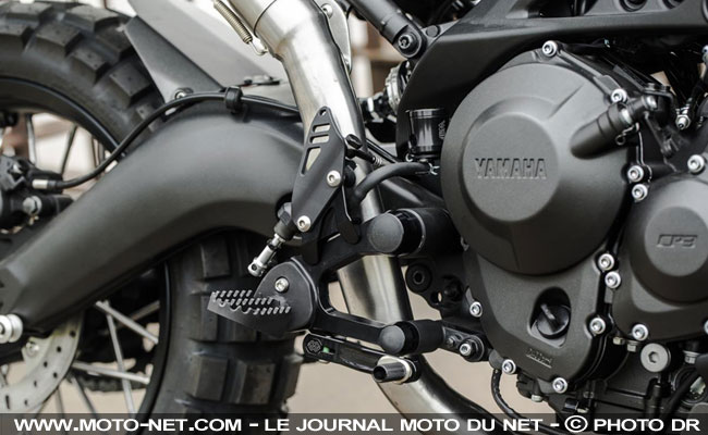 La position évolue aussi par le biais d'une selle spécifique et d'un guidon relevé Magura, tandis qu'un silencieux SC Project se charge de donner de la voix aux 115 fougueux chevaux du 3-cylindres de 850 cc (relire notre Essai de la XSR900 et notre Duel XSR900 Vs Speed Triple S). Plusieurs pièces "maison" complètent cette transformation, à l'image du pare-carter ou des garde-boue en aluminium.