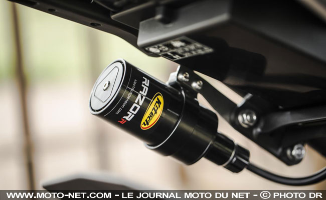 Un amortisseur K-Tech à bonbonne séparée et des durits de freins renforcées affûtent le dynamisme de la moto, par ailleurs aussi dotée d'un tendeur de chaîne et de repose-pieds typés enduro Gilles Tooling.