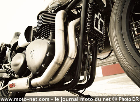 Presque méconnaissable, le gentil cruiser Triumph est transformé en véritable dragster grâce à l'injection de protoxyde d'azote dans son bicylindre parallèle et à une superbe ligne complète 2-en-1 de chez Vance&Hines. Au passage, l'admission a été totalement retravaillée et la boîte à air maison reçoit un filtre K&N.