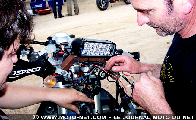 Les 90 minutes habituelles d'assistance sont accordées avant de remettre les machines en parc fermé : montage des phares additionnels et reconditionnement des motos. Un grand merci à Gilles de Tecno Globe pour son aide précieuse à l'assistance ! Le départ de la deuxième étape est prévu à 21h00 : un peu de repos bien mérité pour les pilotes qui n'ont pas été épargnés durant cette étape de près de huit heures !