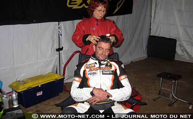 A l'assistance de 30 minutes entre deux tours, on se remotive pour la dernière ligne droite... avec quelques virages quand même ! Dans le stand du Team Moto-Net.Com, Pierre Mouneu profite d'un massage crânien pour lui détendre son neurone, appliqué avec soin par notre assistante-cuistote-mécanicienne-masseuse, la célèbre "Zezette" (Sylvette pour les autres) !