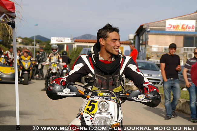 Paul-Christian Piazza ne fait pas de quartier et affiche tout de suite son rythme infernal au guidon de sa KTM 450 EXC en claquant un chrono de 3'14.40 devant Biancucci Carulu et sa KTM 990 SMR (3'17.55) et un troisième Corse, Bruno Langlois sur Ducati 1100 Streetfighter (3'18.20). Le leader du championnat de France 2012, Julien Toniutti (KTM 990 Superduke), se classe quatrième temps, premier pilote "continental" (3'18.54). Faute en revanche pour un autre favori, Michel Marchini sur Honda 450 HM, qui perd l'avant et chute, heureusement sans gravité. Il repart rapidement mais perd une vingtaine de secondes dans la mésaventure.