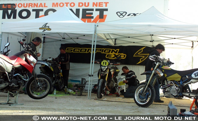 Dans le stand du Team Moto-Net.Com, qui profite du camion d'assistance du 2RTeam (merci encore à Raphaël Bonifay pour son inépuisable talent !), le staff de Tecno Globe s'affaire au reconditionnement des motos pour cette dernière étape de nuit du championnat 2010...
