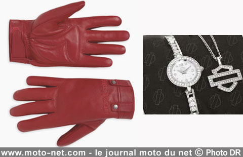 Enfin, pour les bikeuses qui ne sacrifient pas la coquetterie sur l'autel du twin pétaradant, la dame de Milwaukee dévoile une montre et des colliers étincelants, ainsi que des gants en cuir d'un rouge flamboyant !