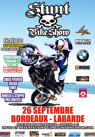 Dernière minute : le Stunt Bike Show reporté au 17 octobre MNC du 16 septembre : le Stunt Bike Show 2010 est reporté au 17 octobre Sur les 800 mètres de la piste de Labarde à Bordeaux (33) dimanche 26 septembre, le Stunt Bike Show 2010 promet son lot de sensations fortes et d'acrobaties toujours plus spectaculaires (lire notamment notre Présentation du Stunt…